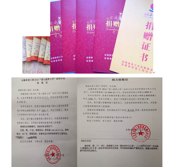 朱永媛同学一直热心公益,积极从事志愿服务活动,懂得感恩,乐于付出。从本科开始, 坚决响应院党委号召,主动深入凤凰山社区参加“党员服务日”活动,定期参加芜湖培智学校志愿服务活动,先后8次前往合肥大蜀山园林区认领树木栽种,努力为环保事业做一份贡献。去年七、八月,冒着酷暑,担任李鸿章故居讲解志愿者,热情大方、表达流畅,善于沟通,深受到访者的欢迎。多年来,她将自己兼职模特积攒奖金全部捐助给安徽理工大学唐志翔、安徽农业大学汪浩在内的多名贫困大学生。2000元、3000元、4000元……,一次次的捐款,一次次的爱心,数年的坚持,帮助了一名又一名贫困学生,累计捐款近四万元,朱永媛用自己的爱心帮助这些贫困学子插上了腾飞的翅膀!