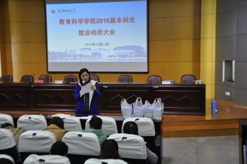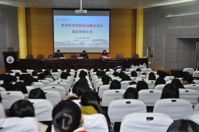 本网讯(教科院 张玉楠)11月23日上午,学院在田家炳报告厅召开2016届毕业生就业动员大会。院党委书记刘晓宇、院长葛明贵出席了本次会议,毕业班辅导员孟庆娟、2016届毕业本科生及研究生参加此次大会。会议由学院党委副书记张如华主持。