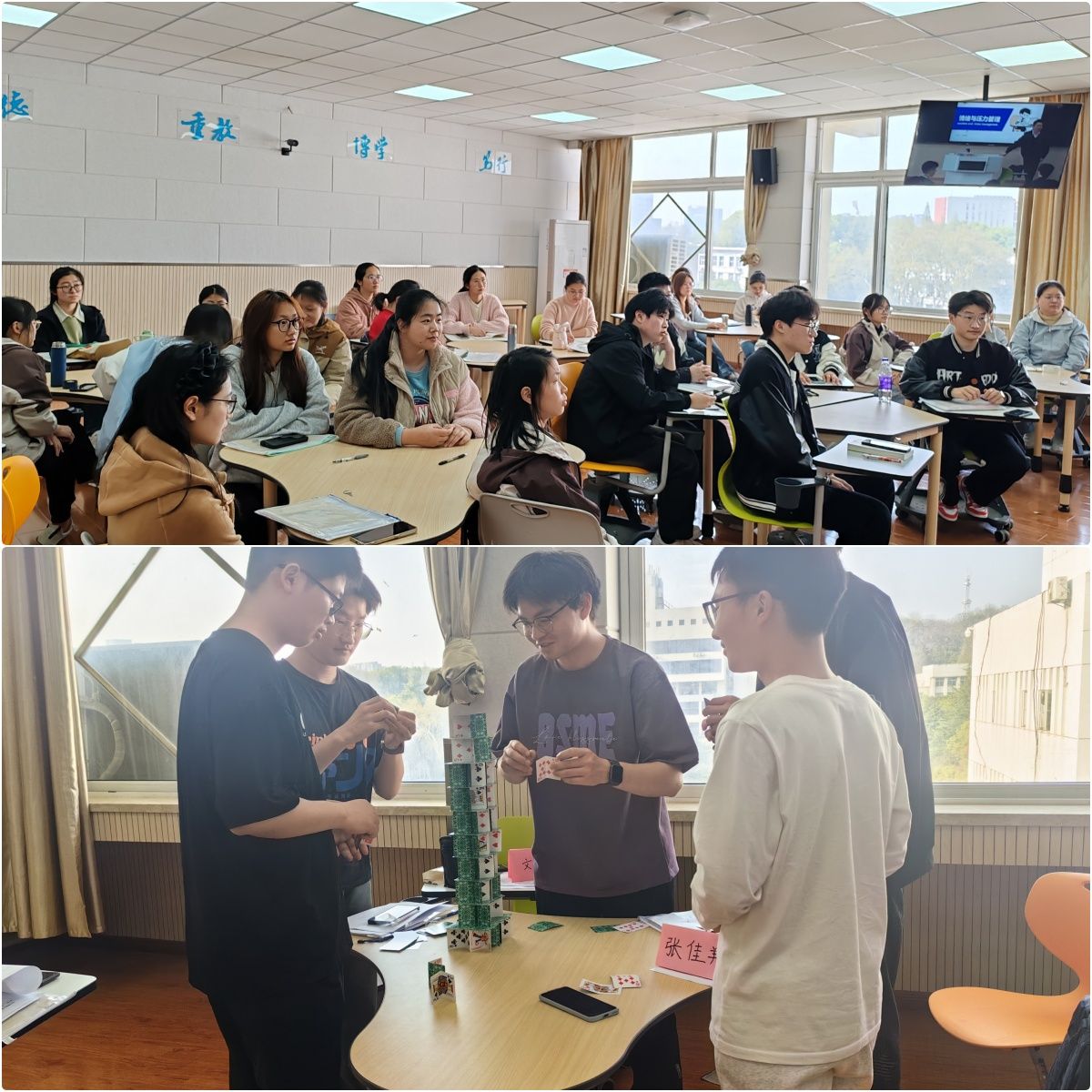 提升营开班前,学院组织教师参加相关学习培训,并成立集体备课小组,精心设计课程内容并多次磨课,内容涵盖“团队合作”“人际沟通”“时间管理”“压力和情绪管理”“生涯决策与适应”“生涯蓝图”等6个主题,每场主题均结合学生前期调研个性化定制,培训通过理论讲授、游戏活动、案例实操、角色扮演等方式开展,确保学员全程沉浸式参与体验。