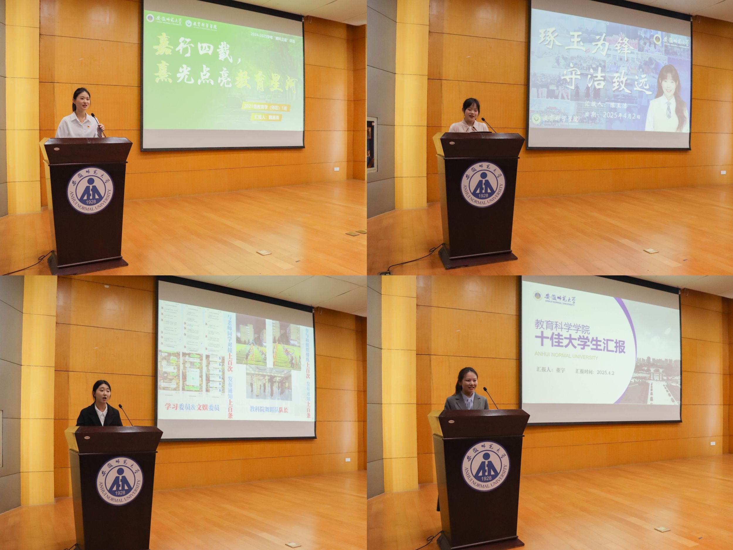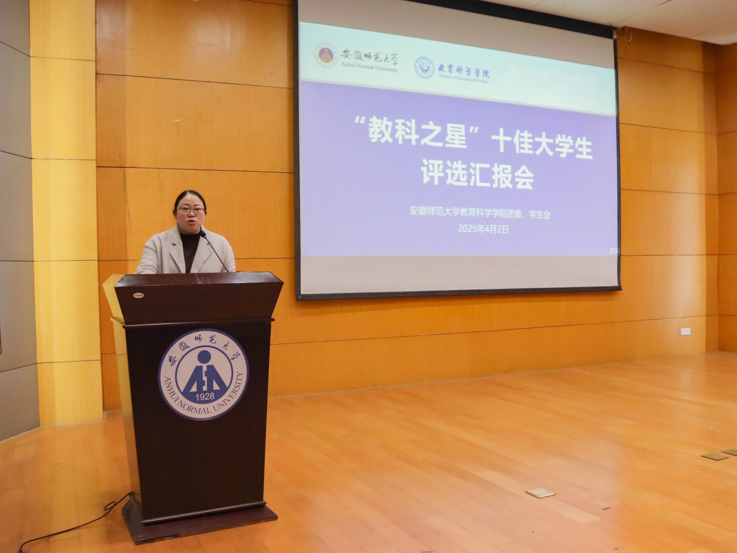 为贯彻落实大学生护航行动计划,树立优秀学生典型,发挥榜样示范作用,引导青年学子踔厉奋发、勇毅前行。4月2日晚,教育科学学院于赭山校区田楼报告厅举办第四届“教科之星”十佳大学生评选汇报会。院党委副书记杜凤、小学教育全科型专业负责人王芳、本研各年级辅导员出席活动并担任评委,各年级学生代表现场观摩。