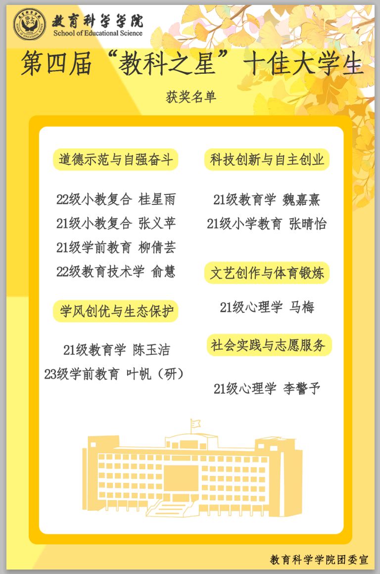 “教科之星”十佳大学生评选挖掘不同领域的优秀典型,选树身边的榜样,激励同学们在专业深耕中锤炼本领,在实践奉献中涵养品格。希望更多教科学子全面发展,争做德才兼备、知行合一的新时代教育先锋。