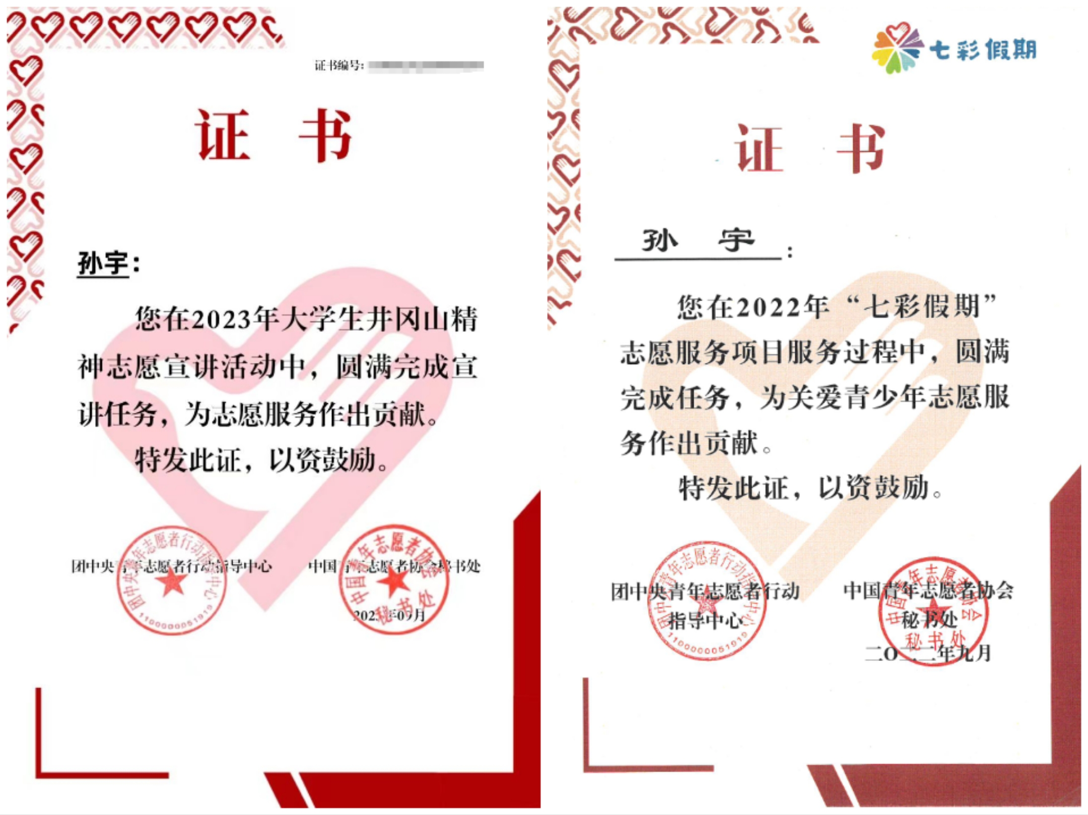 他连续三年参加寒假线上云支教志愿服务活动。在2022年的寒假,他积极报名“乐享云支教”活动,向马鞍山和县高二学生讲解高中物理知识点,并在2023年的暑假高考后收到来信,表达了她们内心的感谢。2023年寒假,他参加“行走思政课堂”社会实践,通过互联网把高中数学的知识带给和县的学生,进行线上云支教,并获校级一等奖。2025年寒假,他参加“行走思政课堂”线上云支教志愿服务,讲授初中英语,为期10天的志愿服务,他细心讲解相关语法知识,受到学生家长好评。