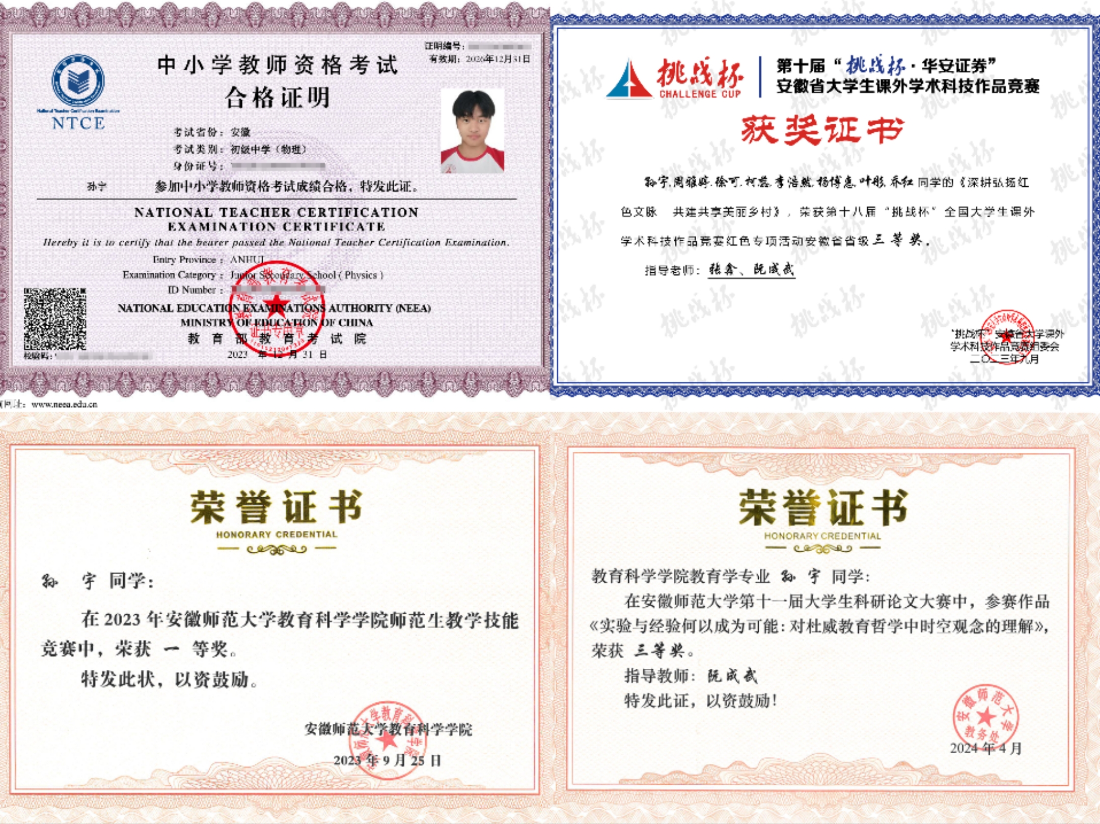竞赛使人共享智慧,行稳致远。他作为第一主持人成功申报省级大学生创新训练项目《义务教育学校作业评价改革现状及优化策略研究》,同时作为核心成员参与导师组内国家级大学生创新训练项目《社区教育赋能义务教育课后服务促进家校社协同育人的路径探索》。他作为第一负责人完成《安徽省中小学生红色资源了解程度及继承弘扬意愿的调查研究》,获第十届“挑战杯”红色专项安徽省三等奖。