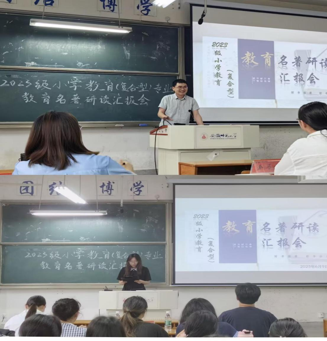 2025年6月9日下午,小学教育复合专业在田楼8101教室举行了本学期教育名著研读总结汇报会。本次会议旨在对学期师生共同研读教育经典的学习成果进行总结和展示,促进师生间的交流。教育科学学院副院长韩建涛、小学教育复合专业负责人陈晨,以及姚运标、肖龙、金马妮等老师出席了本次活动。