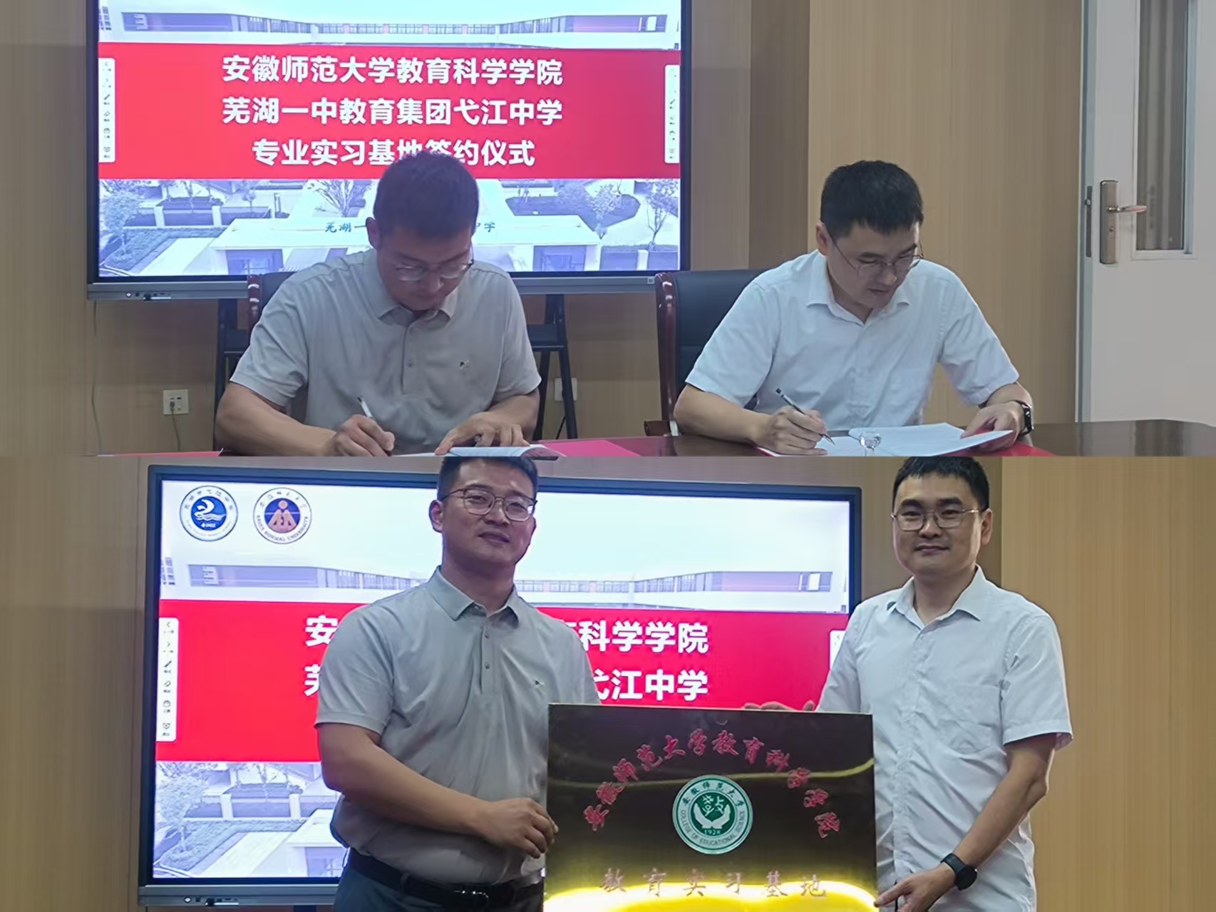 2025年9月17日,学院副院长韩建涛、教育技术学专业负责人肖文,带领6名本科生前往芜湖一中教育集团弋江中学开展教育实习,并与该校共同举行教育实习基地共建签约及授牌仪式。芜湖一中教育集团弋江中学校长杨祥、副校长王恩国及教务处、办公室等部分负责人参加了签约活动。
