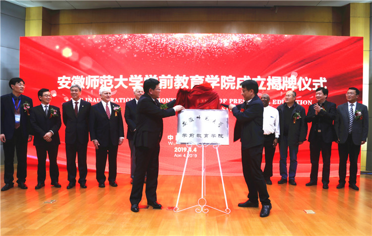 本网讯(文/教科院 孟庆娟 图/党委宣传部 张鑫)四月芳菲春意浓,高朋满座幼教兴。4月4日下午两点,伴随着美丽的幼教天使们欢快的舞蹈和激扬的歌声,安徽师范大学学前教育学院成立揭牌仪式在赭山校区田家炳教育书院三楼报告厅隆重举行。校党委书记顾家山,芜湖市教育局党委书记、局长江汛,安徽商贸职业技术学院院长李忠,校党委常委、宣传部部长胡靖,中国学前教育研究会学前教育基本理论专业委员会主任、华东师范大学博士生导师刘晓东,特邀嘉宾美国布莱诺大学校长Edward Schrader、董事会主席Peter Miller、教育学院院长Eugene Williams,以及国内外学前教育领域的专家学者,省内兄弟院校教育学院院长、学前教育系主任,省内各地市学前教育教研员代表、幼儿园园长代表,安徽师范大学各职能部门领导、教育科学学院领导和学前教育专业全体师生参加了揭牌仪式。仪式由校党委常委、副校长朱家存主持。