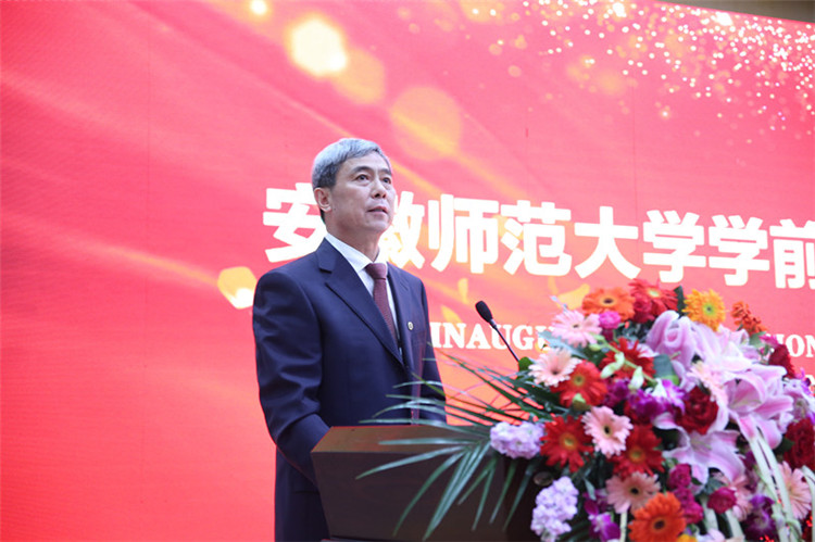顾家山在致辞中介绍了安徽师范大学深厚的历史底蕴和突出的人才培养成效,强调学前教育是国民教育体系的重要组成部分,是终身学习的开端,是学校教育的源头,对学生的健康成长和全面发展具有启蒙奠基的重要作用。他指出,成立学前教育学院,是学校贯彻党的教育方针、落实中央省委决策部署、促进教育公平的重要举措,是服务经济社会发展、深化教育供给侧改革、打造教师教育品牌的重要探索。他希望学前教育学院建设工作组和有关单位,提高站位,落实责任,超前布局新学院的建设发展,做到“以科学理念建院、以质量内涵立院、以特色优势兴院、以开门开放活院”。