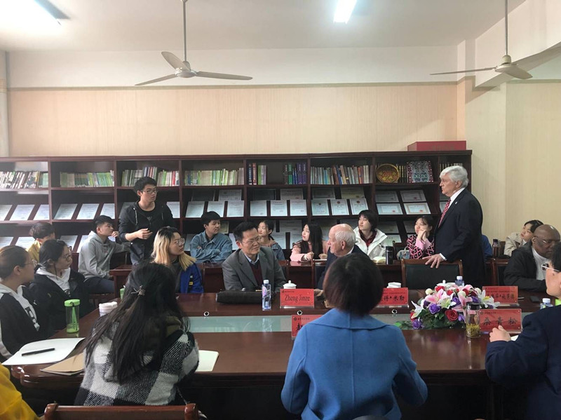 本网讯(程啸 郝婧婧)2019年4月4日,美国布莱诺大学代表团做客安徽royal皇家88平台,与学前教育(中外合作)的师生进行亲切交流。座谈会由学院桑青松院长主持,美布莱诺大学施奈德校长、米勒主席、尤金院长,校国际交流处处长黄圣炯、基金会郑金泽老师、教科院党委副书记张如华、中美专业负责人赵学菊老师出席此次会议,参会的还有2017和2018级学前中美专业的全体学生。
