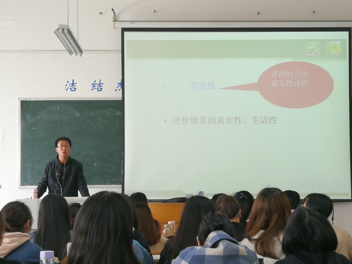本次王老师讲授的课程是《学前教育评价》,在课上,王老师充分运用多种教学手段以及多媒体,结合自身经验,通过举实例、播放图片等方法将深奥的问题生活化,生动的为学前教育专业的同学们讲述了学前儿童学习与发展评价的指导思想,包括发展性、真实性、整体性、看得见四大方面。在发展性方面,老师指出评价不仅仅是指儿童的现在、过去,还要指向儿童的未来,评价应该是动态评价;在真实性方面,老师指出对于儿童评价的情景应该是真是的,日常的,应该具有针对性和指向性;在整体性方面,评价要包含诸多领域,也应该针对某一具体方面;在看得见方面,老师指出评价者要提供看得见的证据。