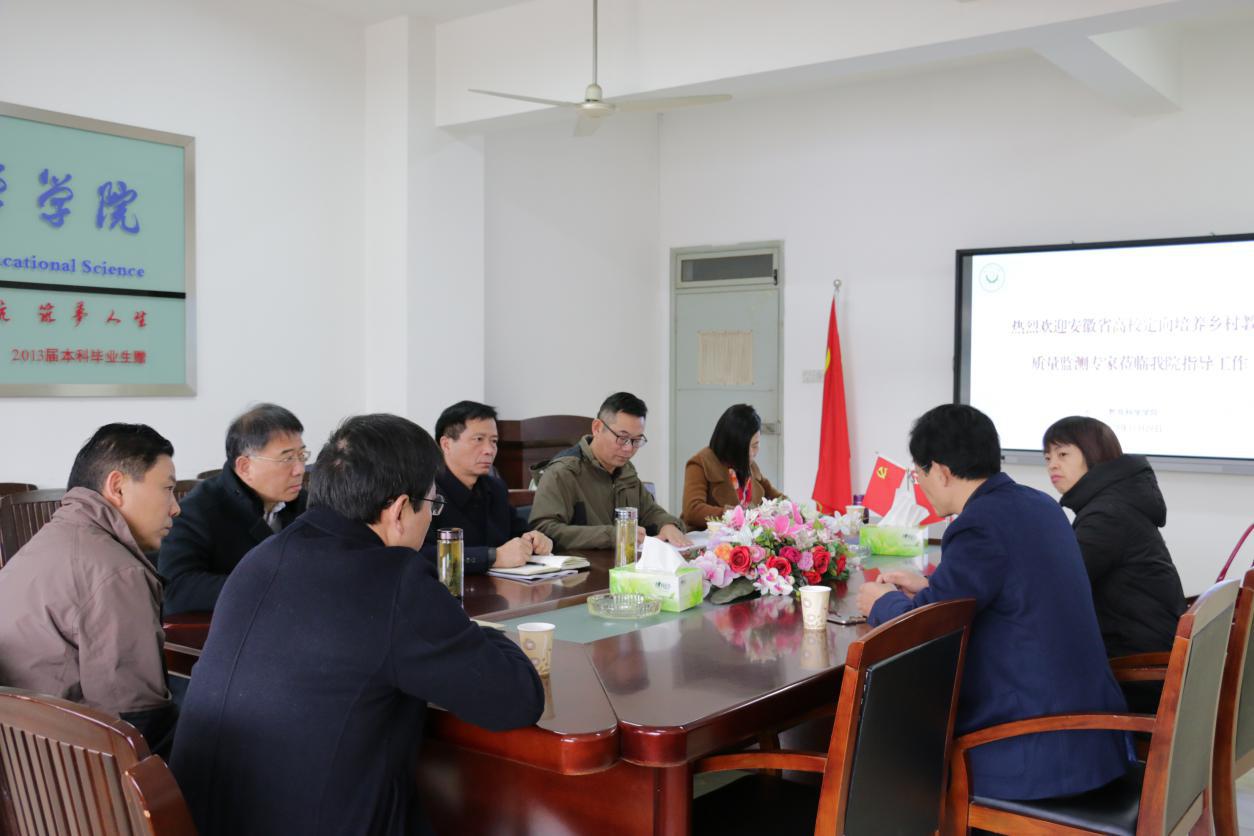 本网讯(教科院 刘标)2019年11月28日至30日,安徽省教育厅师资处马家松副处长携四位评估专家组成员莅临我院,在查阅乡村教师定向培养协议资料后与我院教师、学生分别开展了关于小学教育专业办学质量监测的座谈会,为小学教育专业的发展共同出谋划策,并且于30日上午观看了无生上课展示。