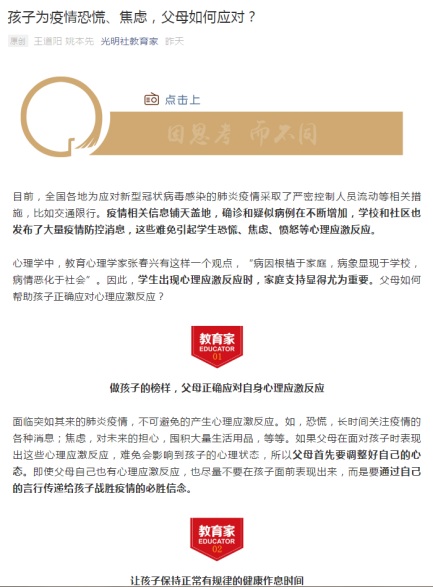 心理学教师也积极在各级媒体中发表抗击疫情心理援助的科普文章。心理学专业负责人王道阳副教授、姚本先教授共同撰写的《孩子为疫情恐慌、焦虑,父母如何应对?》一文发表在光明日报社《教育家》杂志上。