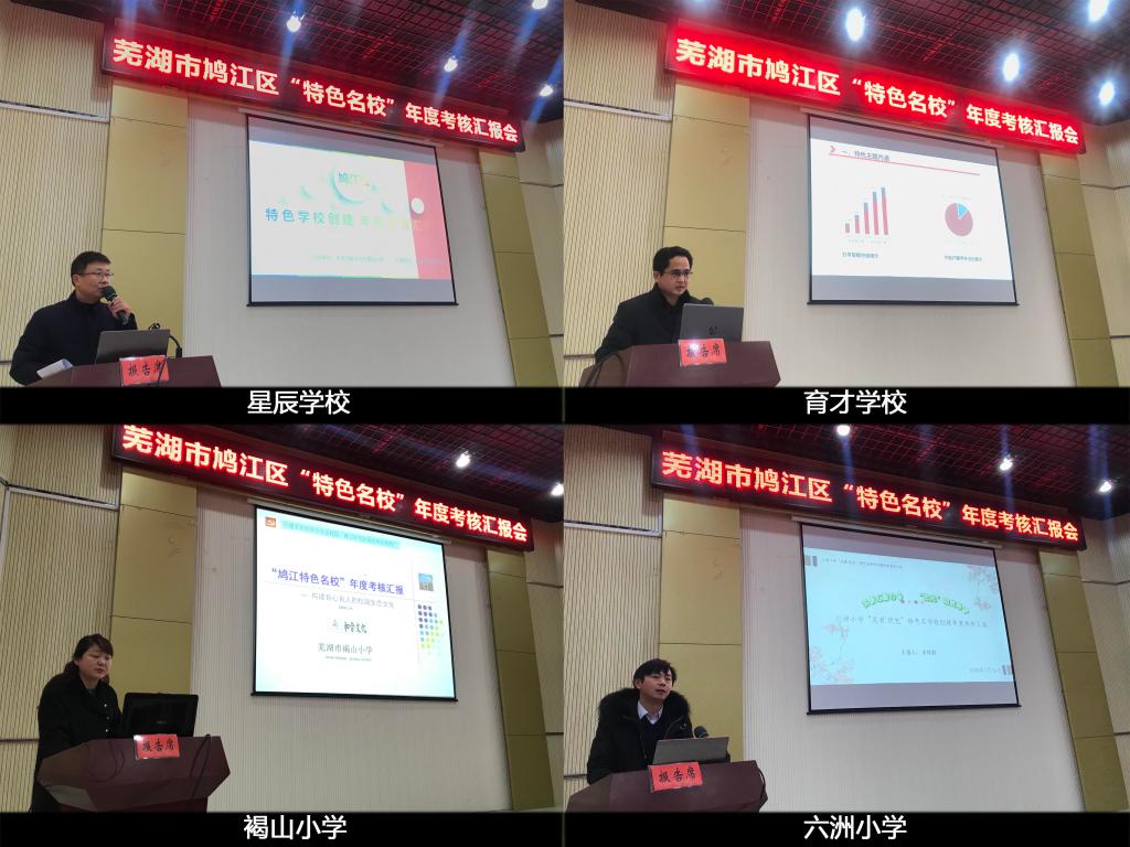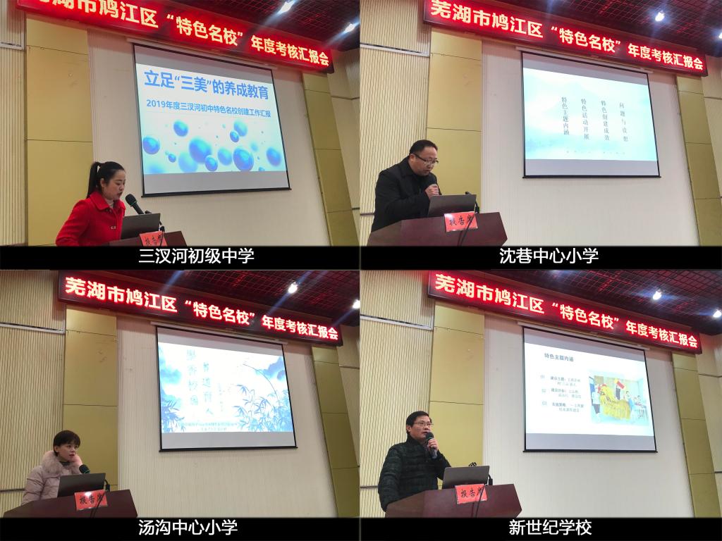 此次会议旨在根据《芜湖市鸠江区教育系统“三名工程”“鸠江特色名校”年度考核方案》,对照鸠江“特色名校”的建设要求,对建设学校开展全面、系统的考评,以期切实发挥特色名校的示范、引领和辐射作用。上午的汇报环节由三十二中学、二坝中心小学、翰文学校、三汊河初级中学、沈巷中心小学、汤沟中心小学、新世纪学校、星辰学校、育才学校、褐山小学、六洲小学依次进行了2019年的特色名校创建总结PPT汇报,五位评委进行现场评分。汇报PPT内容包括特色主题内涵,特色活动开展、特色创建成效、问题与设想四个维度。各校汇报主题分别为“足下逐梦、快乐足球”、“‘向真’特色课程建设”、“智达翰林,体通文质”、“立足三美的养成教育”、“建诗韵校园,韵诗意师生”、“墨香校园,书道育人”、“五育并举,树‘三品’新人”、“学校·社区·家庭三结合教育”、“传承粟裕精神,坚持三全育人”、“构建育心育人的校园生态文化”、“关爱汇聚力量,‘优先’构筑希望”。