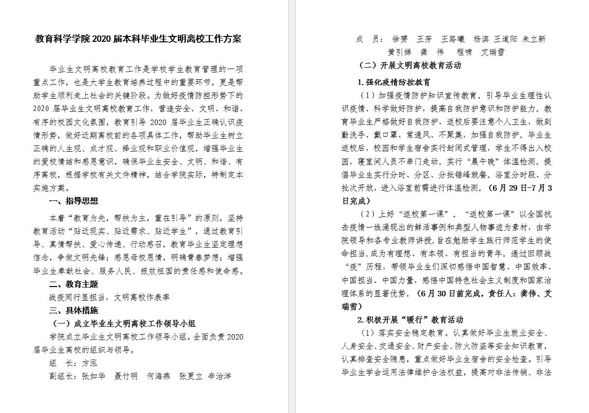 教科院历来高度重视毕业生文明离校工作,本着“教育为先,帮扶为主,重在引导”的宗旨,通过“思想引领、教育引导、真情帮扶、爱心传递、行动感召”五大载体,持续培养学生的爱国主义情怀、提升学生的社会适应能力、注重学生的专业实践能力、强化学生的传统美德观念和抓好学生的成才励志教育,切实教育毕业生坚定理想信念,争做文明先锋;明确青春梦想,科学规划人生;感恩母校恩情,展现骄子风采,在奉献社会、服务人民、报效祖国的历史担当中增强毕业生的责任感和使命感。别宴将至,骊歌渐起,真诚祝愿教育科学学院2020届全体本科毕业生致知力行,继往开来,前程似锦,事业有成!
