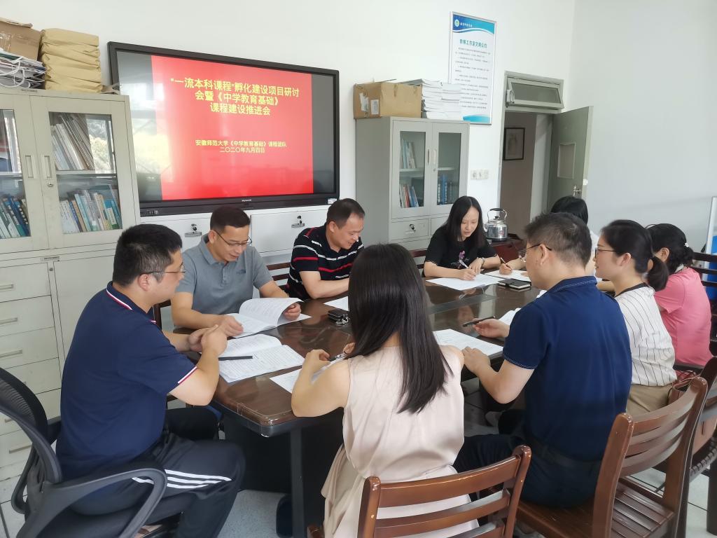 本网讯(教科院)为认真贯彻《教育部关于一流本科课程建设的实施意见》《安徽师范大学一流本科教育五年行动计划(2018-2022)》等文件精神,切实做好校级“一流本科课程”孵化建设工作,安徽师范大学公共教育学课程团队于2020年9月4日下午14点召开“一流本科课程”孵化建设项目研讨会暨《中学教育基础》课程建设推进会。会议由课程负责人李卯老师主持,教育科学学院副院长辛治洋教授、教育学专业负责人徐赟副教授、团队核心成员柳丽娜、徐群、马兴、薛卫洋、滕曼曼、陈娜等老师参与本次会议。