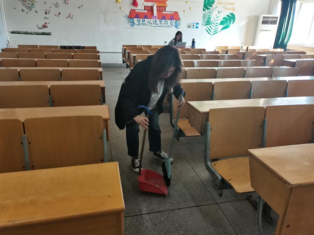 11日下午,夕阳映照下的田楼多了一抹亮丽的身影。党员教育培训班的25位学员兵分两路在每层楼的楼道,每间教室,打扫同学们上课时遗留在教室边边角角的垃圾并擦拭每一张桌子、每一块黑板。