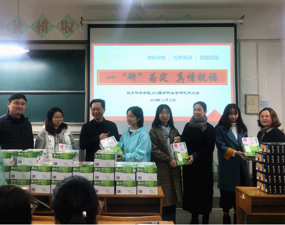 随后,学院领导老师为同学们发放了考研慰问品。一箱箱牛奶、一袋袋面包、一盒盒饼干寄托着学院对考研学子们的关怀与祝福,在寒冷的冬天里,为奋战在考研路上的同学们送去了一份暖心的问候。