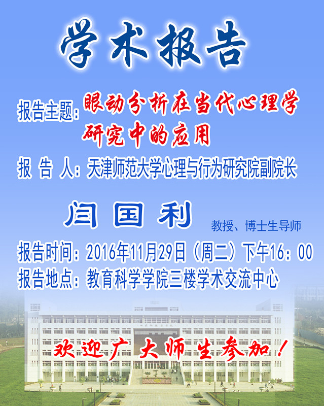 学术报告预告——天津师范大学心理与行为研究院副院长闫国利学术报告