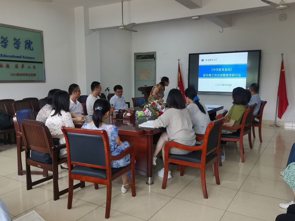 本网讯(教科院 徐群/文 盛梦蕾/图)为进一步提升教师教育核心课程《中学教育基础》的教学质量,帮助青年教师尽快融入成长,提高学生对课程的满意度,9月7日下午,安徽师范大学公共教育学课程团队进行了新学期工作安排和教学研讨活动。教科院韩建涛教学副院长和担任本学期授课任务的全体教师参加了会议,会议由课程负责人徐群老师主持。