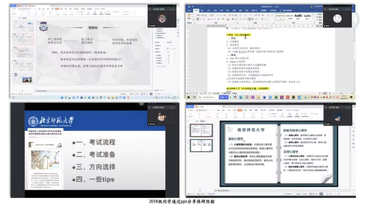 本网讯(教科院 邓心宇)为了帮助2019级心理学具有保研资格的同学们能够更好地应对即将到来的预推免复试,学院邀请了2018级心理学保研成功的五位同学,于2022917日下午在腾讯会议线上平台分享保研经验。本次会议由心理学专业负责人王礼军副教授主持。