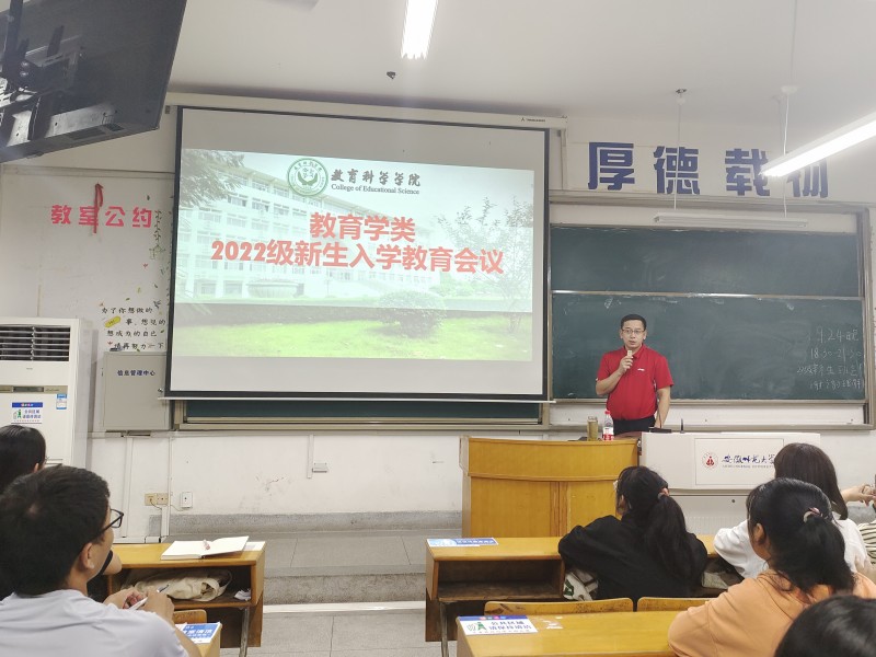 本网讯(文/乔琳颖 图/乔琳颖)9月24日晚七点,教育科学学院于田家炳楼8202教室开展2022级教育学类新生入学教育活动。教育系主任徐赟老师及2022级教育学类全体新生参与会议。本次会议由2022级本科生辅导员程雅楠老师主持。