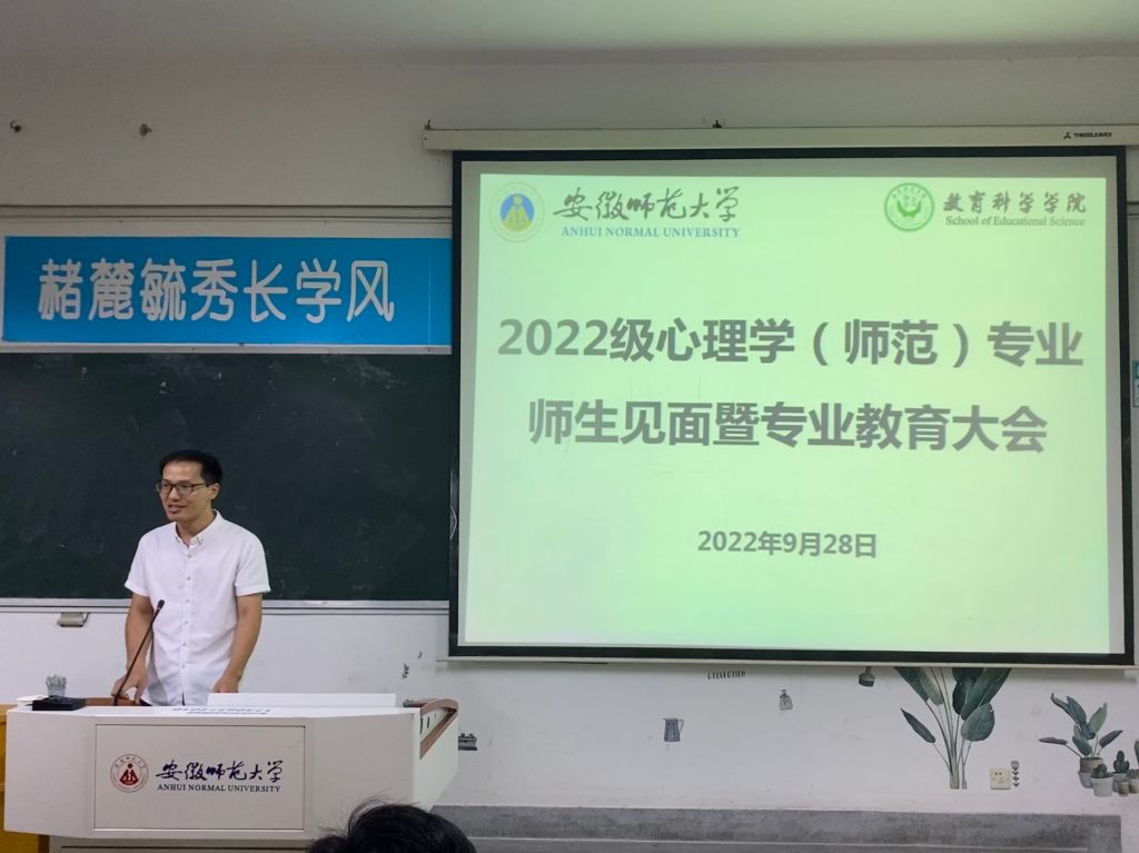 教育科学学院心理学专业历来重视本科生人才培养工作,丰富形式开展入学教育,为学生成长发展领路导航。此次师生见面会暨专业教育大会的顺利召开帮助新同学熟悉了专业学习与发展前景,2022级心理学本科生也即将在国庆之后正式开启大学的学习新征程,以勤奋和汗水书写青春新篇章,创造人生新成绩。安徽师范大学心理学人也将继续注重人才培养,加强队伍建设,加速心理学专业的不断壮大。