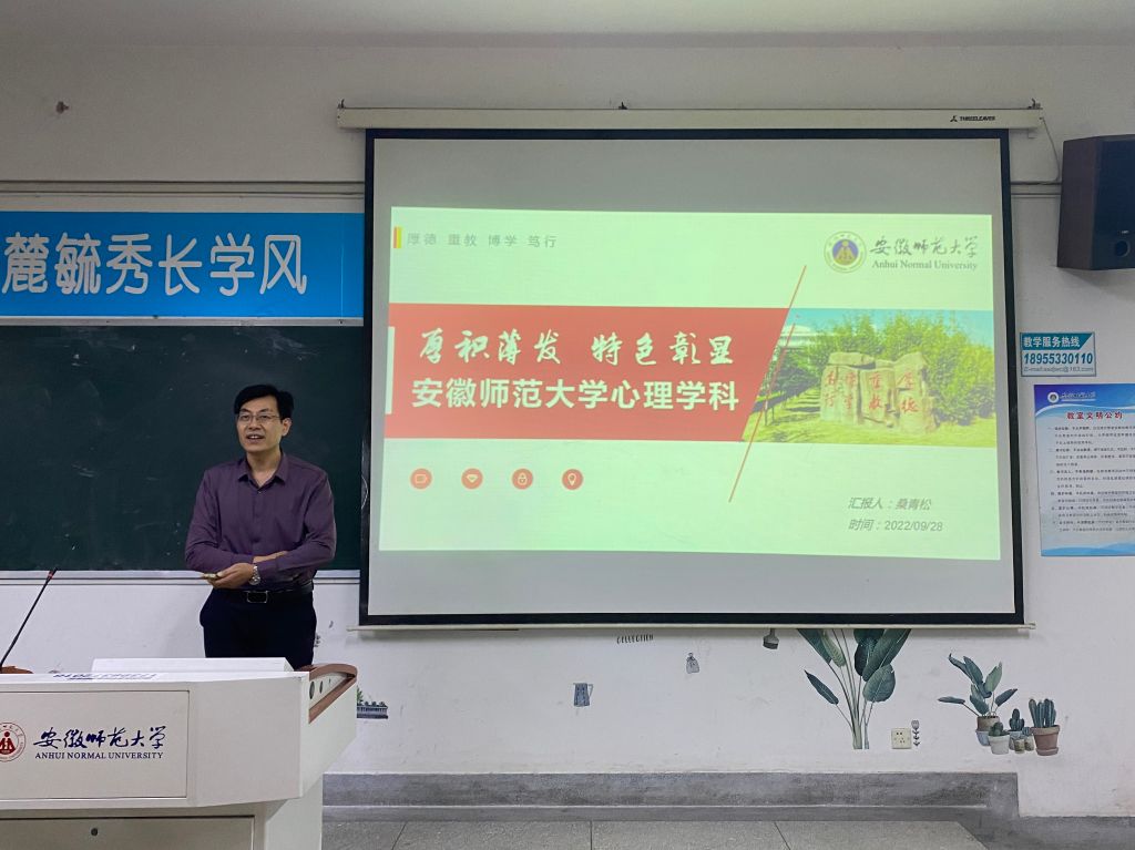 随后,桑青松从安徽师大心理学科的过去和现在、擦亮师范特色并培养卓越教师、服务地方社会并注重应用研究三个方面展开了详细的介绍。安徽师大心理学科自建立学科以来,培养了多位心理学人才,同时在不久的将来也会引进更加优秀的教授名师加入,希望同学们既能有学科自信,也要抓紧这宝贵的机会、资源,更加坚定不移地走心理学的学术道路。除此之外,对于心理学的学科运用和就业方向,桑青松也通过图文结合的方式生动地呈现给了同学们,并提出建议:希望同学们能够明确本科阶段的目标定位,一步一脚印地累积专业知识,为了将来地发展打下坚实地基础。