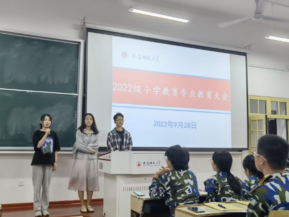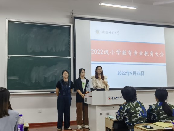 本网讯(教科院 刘子怡)9月28日晚7:00,教育科学学院在教学楼1401教室召开2022级小学教育(全科型)专业教育大会,专业负责人王芳老师,班主任陈元龙老师、吴颖老师和杨俊铨老师,9位班导生和2021级优秀学长、学姐代表以及2022级小学教育专业全体新生参加大会。大会由王芳老师主持。