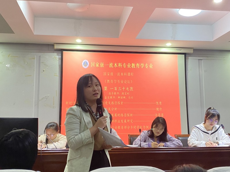本网讯(文/谢雅雯 乔琳颖 图/谢雅雯)10月9日晚,在教育科学学院三楼学术交流中心,国家级一流本科专业建设点教育学专业顺利举办第一百三十七次专业论坛。莅临本次专业论坛有小组指导教师路宝利以及嘉宾教师柳丽娜和马兴,20级、21级教育学专业全体本科生到场参加,并由20级教育学王悦晓担任主持人。