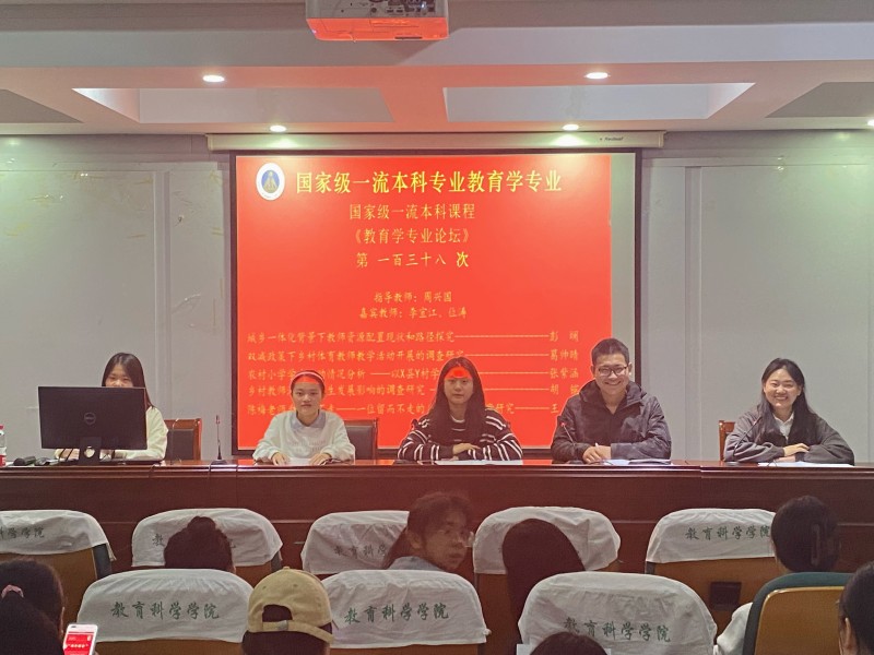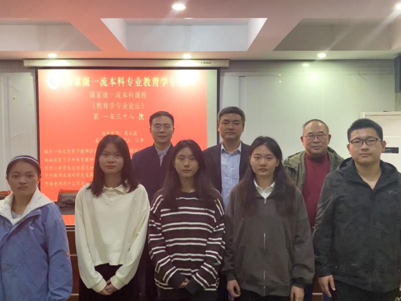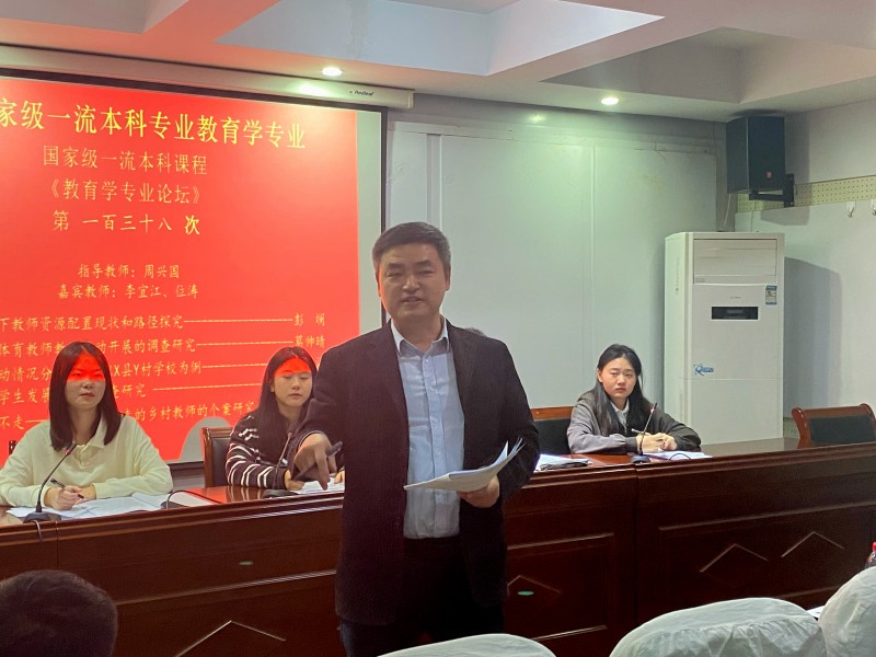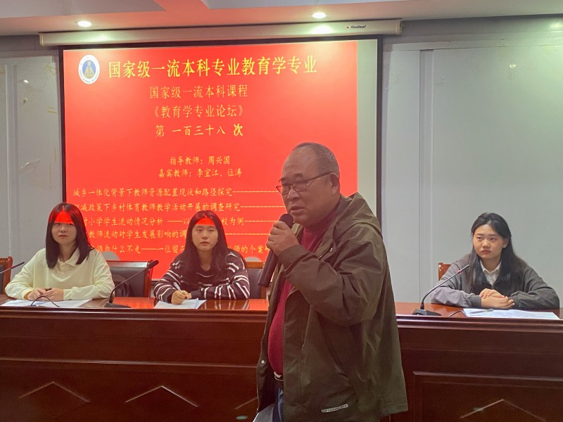 本网讯(文/谢雅雯 乔琳颖 图/谢雅雯)10月23日晚,在教育科学学院三楼学术交流中心,国家级一流本科专业建设点教育学专业顺利举办第一百三十八次专业论坛。莅临本次专业论坛的有小组指导教师周兴国以及嘉宾教师李宜江和位涛,20级、21级教育学专业全体本科生到场参加,并由20级教育学马祎曼担任主持人。