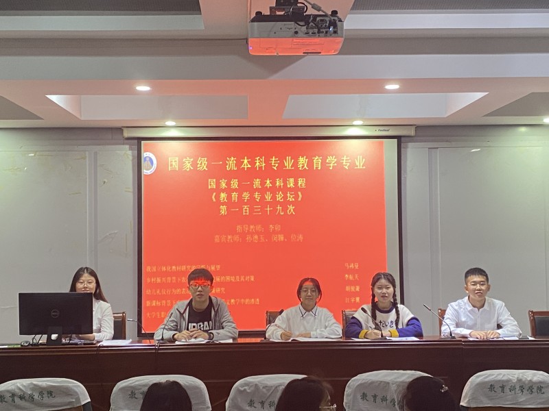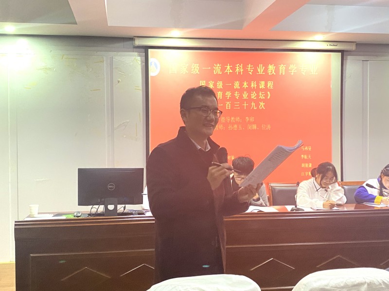 本网讯(文/谢雅雯 乔琳颖 图/谢雅雯)11月13日晚,国家级一流本科专业建设点教育学专业第一百三十九次专业论坛在教育科学学院三楼学术交流中心顺利举行。莅临本次专业论坛有嘉宾教师孙德玉、闵韡和位涛,20级、21级教育学专业全体本科生到场参加,并由20级教育学石金杰担任主持人。