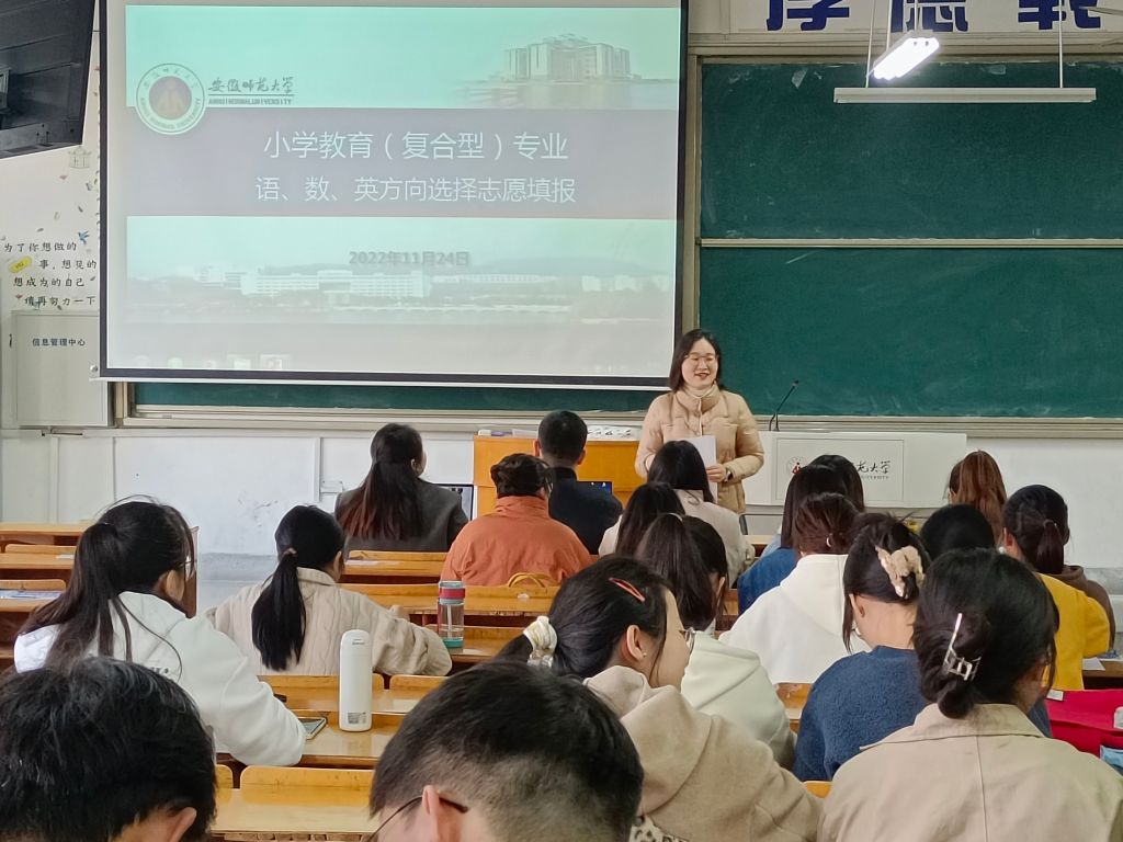 小学教育(复合型)专业立足安徽、面向长三角地区、辐射全国,培养师心坚定、师德高尚、师艺精湛、师能卓越,综合素质突出,能胜任小学语文、数学、英语等科目教学的复合型小学教师以及从事小学教育教学研究、管理工作的专门人才。本次方向分流是继学生进行大类专业分流以后的二流分流,具体分为语文、数学、英语三个方向,后续将分别设置各方向的教学班,建立各方向模块课程的教师队伍,充分体现小学教育(复合型)专业人才培养的专业性、创新性和实践性。同时,此次方向分流大会帮助同学们明确自己的专业方向,为同学们以后的专业学习及个人发展规划提供更加精准的指导。