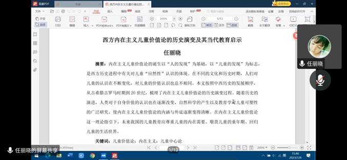 师生互动研讨 夏诗贤、李欢同学先后进行了交流发言。夏诗贤同学提出了质疑,在历史上,童年观念和儿童的内在价值意识诞生于什么时候,是不是要把古希腊时期作为它的起源?李欢同学认为这篇文章体现了在学前教育领域很扎实的研究成果,第二部分很精彩,不仅对历史时期进行了一个梳理,同时深入剖析了在不同历史时期儿童价值逐渐受到重视的演变过程以及它背后的原因。有一个建议:从内容结构上来看第三部分有关当代教育的价值的启示,内容还不够充实,如果把这一部分进一步加强以后,这应该是一篇比较高质量的学术论文。