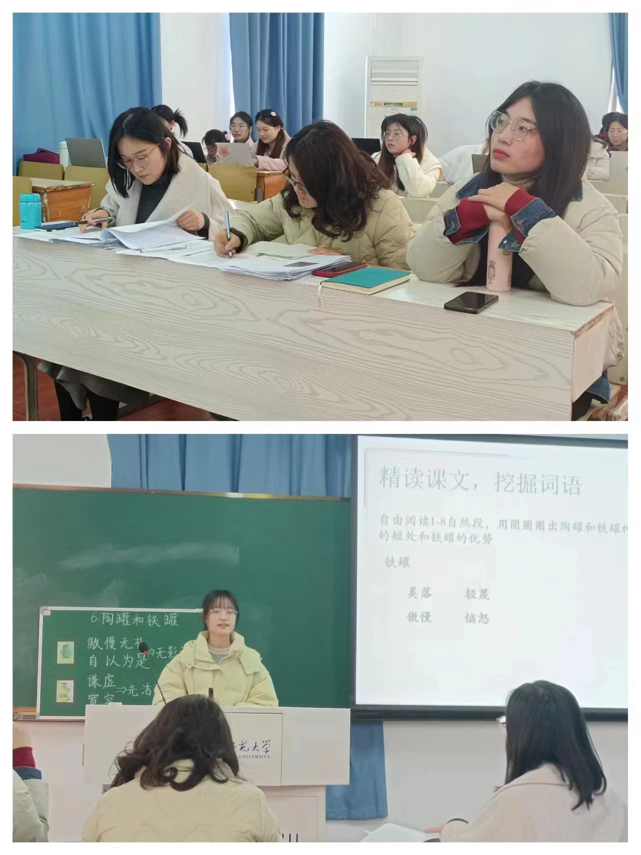 小教(复合型)专业学生三门课程无生上课考核的内容主要是教材中的新课,其中,各学科内也有部分同学开展同课异构活动,组内3-5人共同探究同一主题,体现出了学生对于教材内容的不同解读和教学想法,清晰的普通话、精美整洁的板书、科学新颖的课件、有趣生动的学习活动设计……无不体现了小教(复合型)专业学生的认真、投入和为课程考核所做的充分、细致的准备。三门专业核心课程教学实践考核按时、顺利进行,首先由学生通过亲身体验实践教学,走上讲台,将专业理论教学知识应用于教学实践当中,感受教书育人的心境。最后两位评委老师一一为同学们点评,引导学生从中反思自身的教学需要改进的地方,并给予了宝贵的建议,表示了对同学们的鼓励和期许。