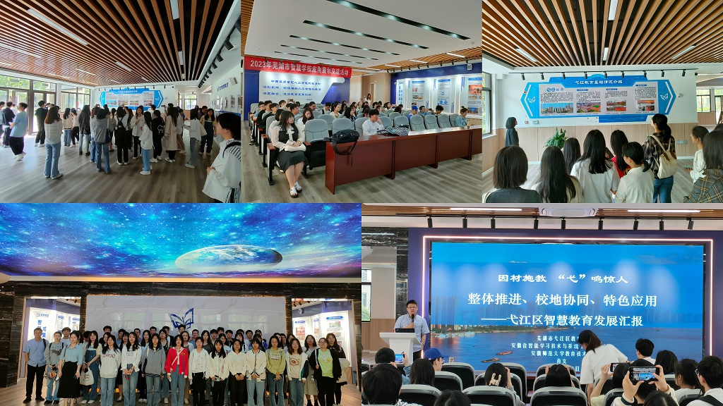 见习活动还前往弋江区智慧教育中心,了解弋江区的智慧教育建设情况。肖文老师向同学们介绍了弋江智慧教育的发展历程、弋江区教育基础情况介绍、智慧教育特色分享,同学们观摩了智慧教育系统的演示和应用,深入了解了其在教学、管理、服务等方面的实际运用效果。