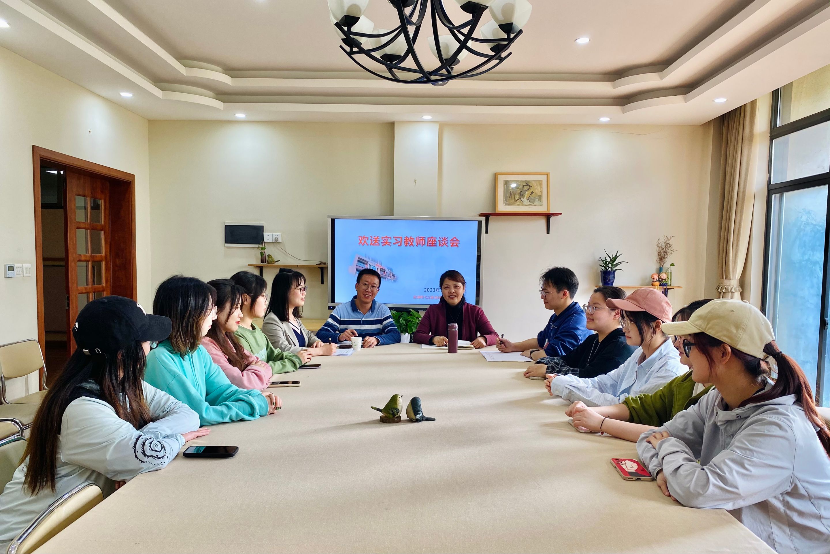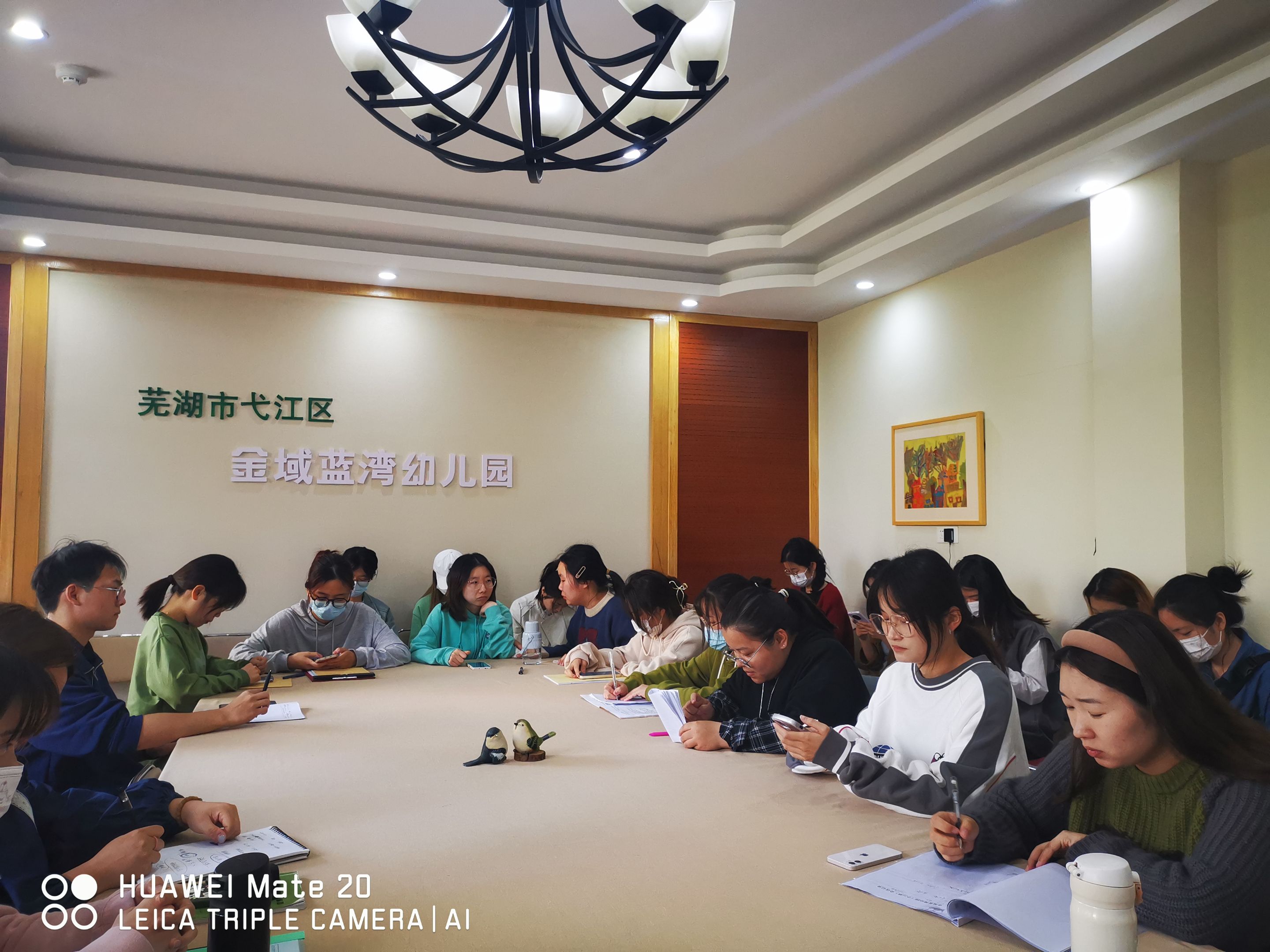 公开课结束后,金域蓝湾幼儿园领导层和安徽师范大学王成刚老师,以及11位实习生在会议室召开教育实习教师欢送座谈会。钱和平园长、方贞梅老师分别肯定了11位实习生在园实习期间的努力与付出、成长与进步,从陌生到游刃有余,从拒绝害怕到热爱向往,看见了实习教师的童心、用心和诚心。会上,11名实习生分别从学习、工作、生活等方面就实习经历中的所见所得、与孩子和指导老师的朝夕相处等方面,表达了自己的实习感悟,言语间流露着对孩子们的爱,对幼教行业的热情。钱和平园长也送上了对实习教师最真挚的祝福:希望大家坚定专业信念,以梦为马,不负韶华,在学前教育道路上不断学习,学思结合,脚踏实地,积累经验,敢于创新并继续秉承认真、努力、反思的教育信念坚定地走下去。