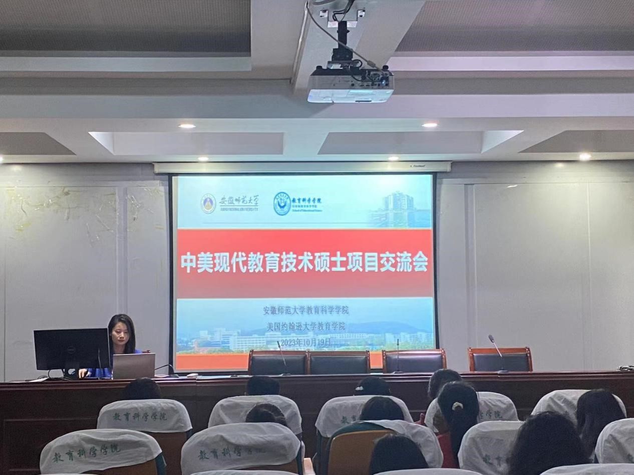 2023年10月19日晚,学院在313学术交流中心开展了面向现代教育技术(中美合作)专业2023级研究生的中美合作项目交流会,会议采用线上线下混合的方式进行。线上邀请了美国约翰逊大学国际关系主任段华博士以及正在美国约翰逊大学深造学习的2022级硕士研究生安宁、陈雨、武洁等同学为大家分享;学院吴文涛副院长线上参会,线下参会的有现代教育技术(中美合作)学位点负责人白倩博士以及23级现代教育技术(中美合作)专业全体研究生。