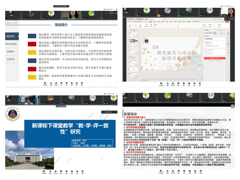 汇报正式开始前,徐赟说明了大创项目完成结题所需达到的各项要求以及本次答辩的整体流程。本次答辩会共有8个项目小组参加,其中5项国家级大学生创新创业训练计划项目立项、4个省级大学生创新创业计划项目立项,实现了大创项目“人人参与,全员覆盖”的目标。项目选题丰富多样,涉及老年智慧教育、小学课后服务、乡村教师资源配置、思想政治课程标准、职教集团共享机制、课堂教学“教—学—评一致性”等。现场答辩流程分为PPT陈述、专家提问、学生作答三个环节,项目负责人按照顺序依次汇报大创项目,从项目背景、研究方法、项目成果、不足与展望等多方面进行阐述。评审老师认真听取汇报、严格把关项目质量,对项目的创新性、科学性与可行性提出相关问题,充分肯定取得优秀成果的项目,并有针对性地从项目内容、材料规范等方面提出指导性建议。会议结尾,徐赟对本次答辩汇报出现的问题进行总结,鼓励同学们在最后阶段结合评审老师意见进一步完善修改,争取高质量地完成大创项目。