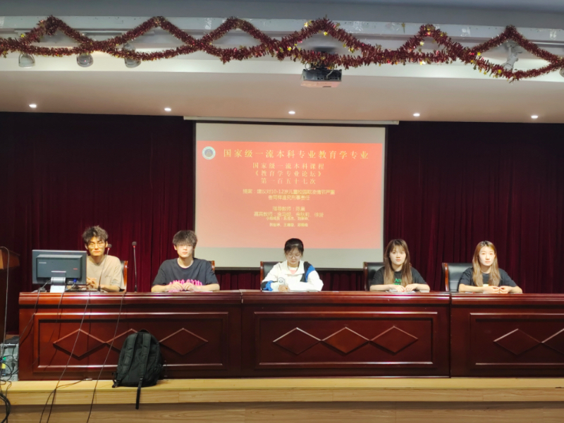 5月12日晚,国家级一流本科专业建设点教育学专业第一百五十七次专业论坛在图书馆报告厅顺利举行。莅临本次专业论坛嘉宾教师有李宜江老师、余秋莉老师、金马妮老师以及徐赟老师和小组指导教师陈晨老师。21级、22级教育学专业全体本科生到场参加,并由22级教育学刘康帅担任主持人。
