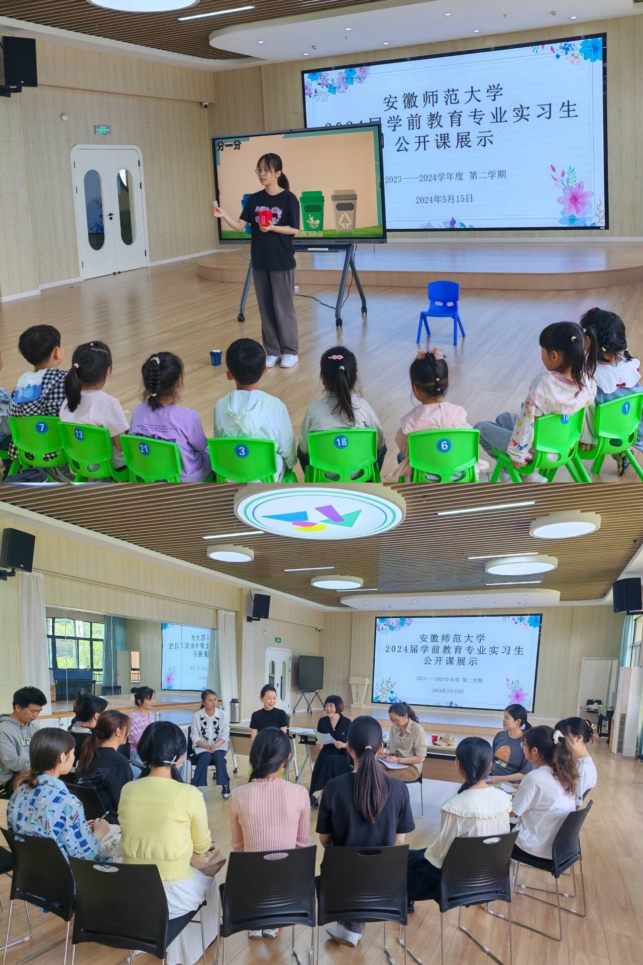 为检测实习质量,进一步提高实习生的实际教学水平,5月15日上午,赵学菊小组与朱言同小组的两组实习生于镜湖幼儿园和镜熙幼儿园开展公开课展示活动,赵学菊老师,镜湖幼儿园杨斌园长,指导老师杨世娇、朱诗雯等及两组实习生对公开课进行观摩。