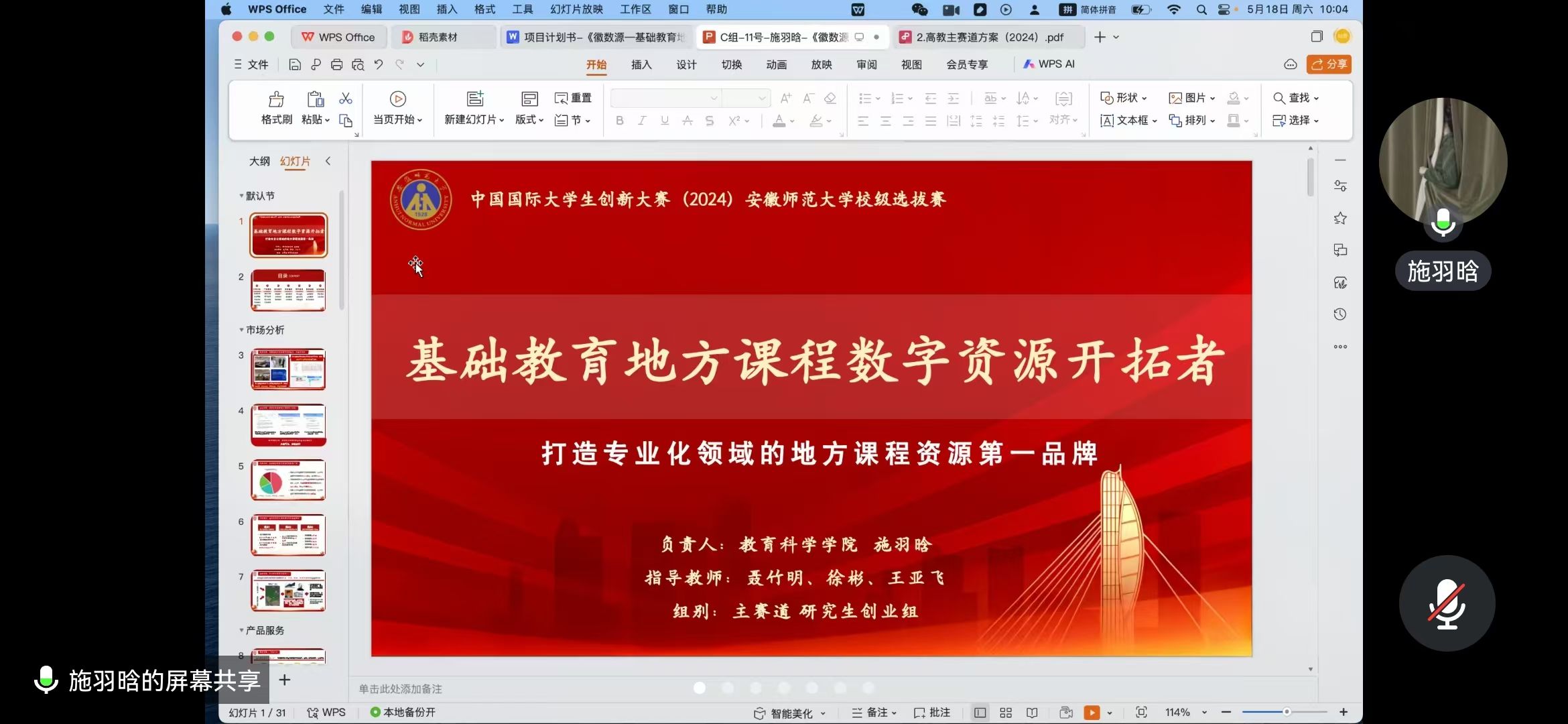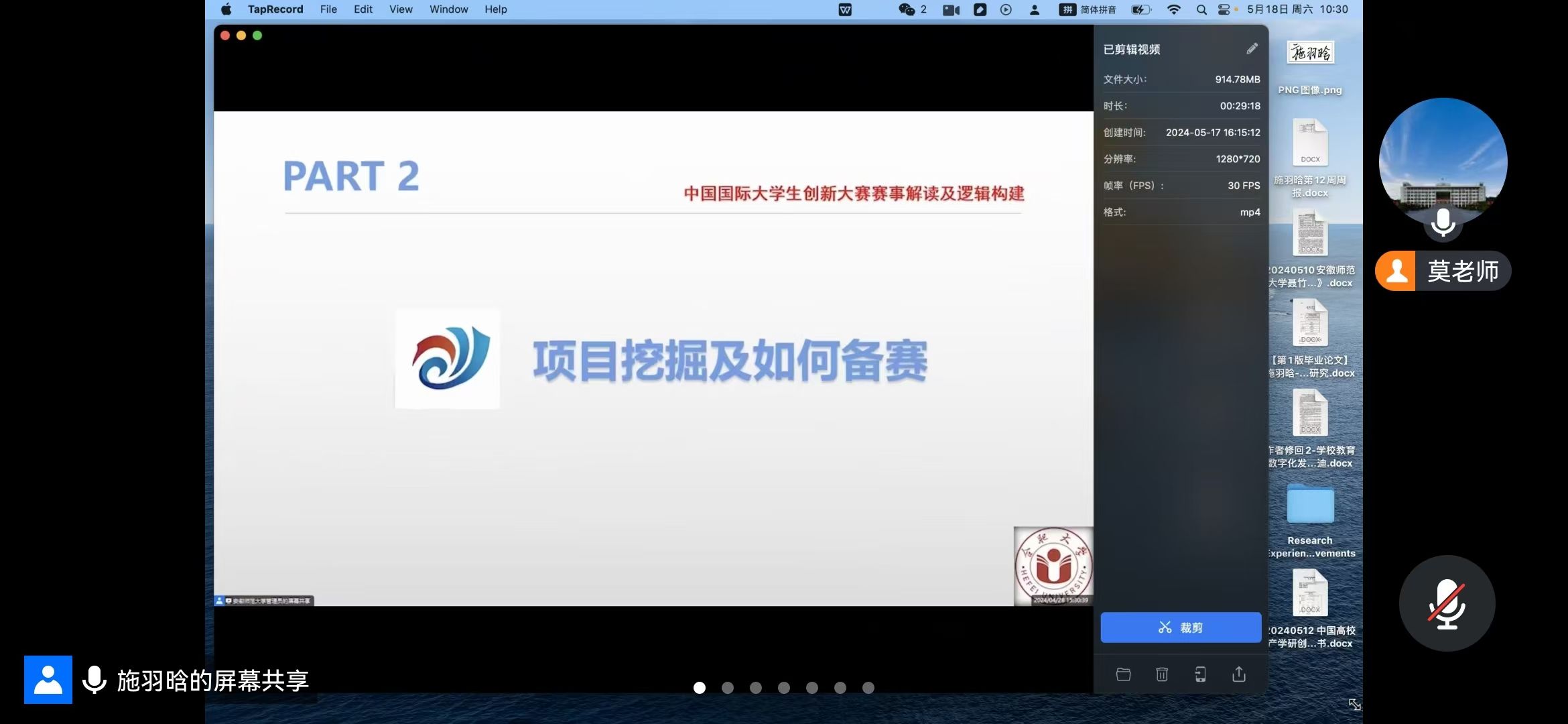 学院往届获奖项目代表、2022级教育技术学硕士研究生施羽晗分别从“研究生参赛组别”、“项目计划书撰写”、“项目基本框架”三个方面分享了她的项目。她从自身参赛经历出发,进行耐心详细地介绍,鼓励同学们将自己定位为创业者,尽可能周到、全面的规划自己的项目,以期能够获得更好的成绩。培训会的第二部分,播放了以“项目挖掘及如何备赛”为主题的赛事解读视频。专家们以精简的语句辅之具体的案例,清晰的给同学们呈现出更加体系化的赛事解读,为他们接下来如何进行谋划备赛提供更多启发。最后,莫大贡老师希望同学们能够立足自己的专业,紧跟时代热点,直击社会痛点,发挥本专业的特点,积极寻求社会合作。预祝本次大赛的参赛同学都能取得佳绩!