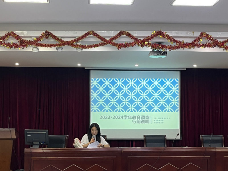5月19日晚,国家级一流本科专业建设点教育学专业2023-2024学年《教育调查》行前说明会在图书馆报告厅顺利举行。会议由吴颖、江珊两位老师主持,课程负责人滕曼曼、教育学专业负责人徐赟以及21级、22级教育学专业全体本科生到场参加。