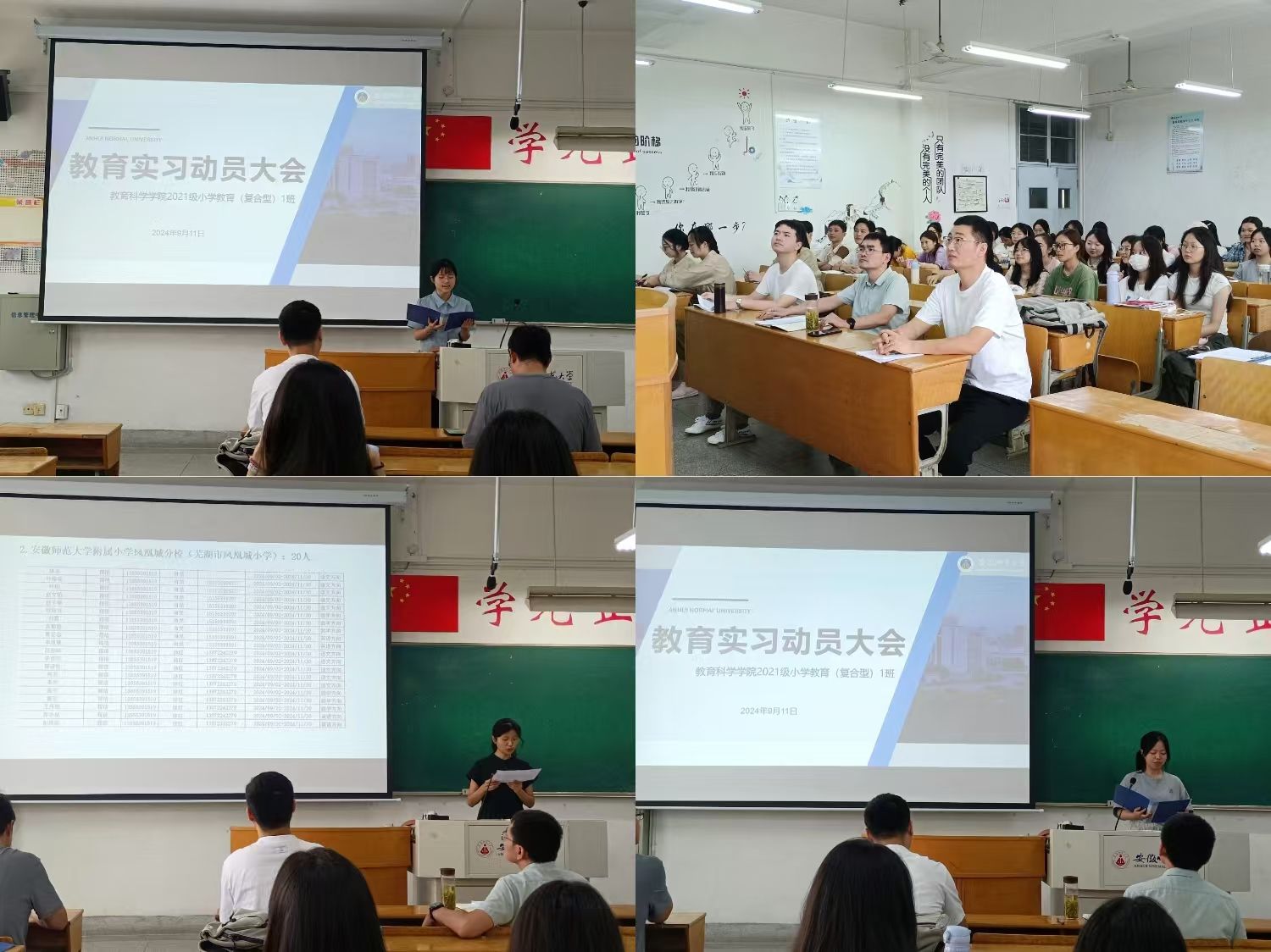 为了增进学生对教育实习的了解,做好相应的实习准备,教育科学学院2021级小学教育(复合型)专业于9月11日下午14:30在赭山校区田楼8309教室开展教育实习动员大会。学院副院长韩建涛,专业负责人杨俊铨,实习指导教师肖龙、刘婉、胡薇、陈元龙,辅导员赵茜,2021级小学教育(复合型)专业全体本科生参与其中。会议由叶格格主持。