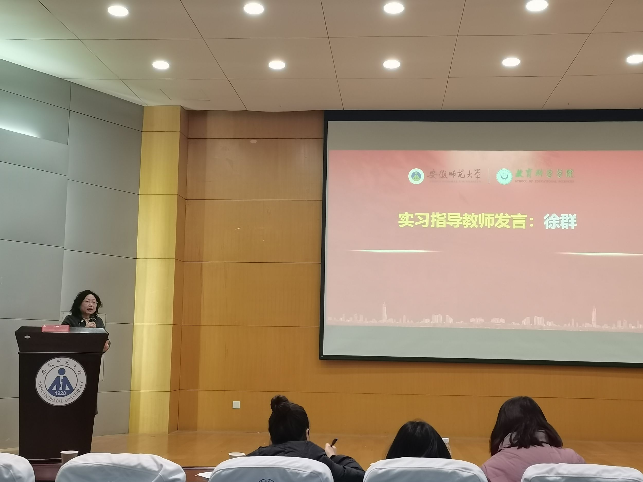 汇报结束后,实习指导老师徐群老师作为代表发言,赞扬了同学们的认真付出与端正态度,建议同学们能以实习总结大会为契机,为自己的教师生涯指明方向,同时要求学生树立反思意识,努力学习专业知识,为提高自身教学能力打好基础。接着马兴老师宣读教育实习推优名单,并为全体实习生的优秀表现点赞。