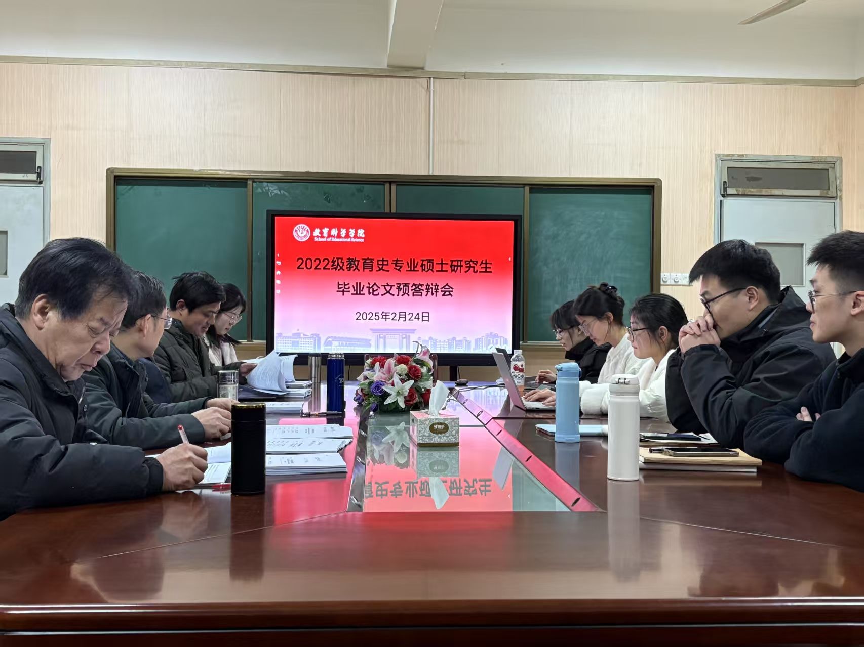 2025年2月24日下午,2022级教育史专业硕士研究生毕业论文预答辩会在学院408会议室召开,孙德玉、李宜江、姚运标、杨俊铨、苏明明老师担任评审专家,会议由孙德玉老师主持。除参与本次预答辩会的硕士研究生外,2023、2024级教育史专业硕士研究生参与旁听。