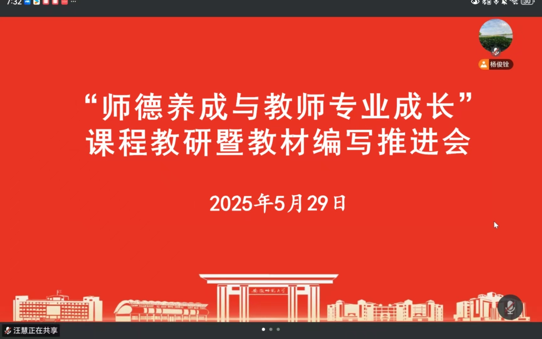 2025年5月29日,“师德养成与教师专业成长”课程教研暨教材编写推进会在线上召开,课程与教材编写组成员杨俊铨、刘婉、位涛、金马妮、魏晓敏、肖龙、苏明明等教师参加会议,会议由杨俊铨老师主持,课程助教参与旁听。