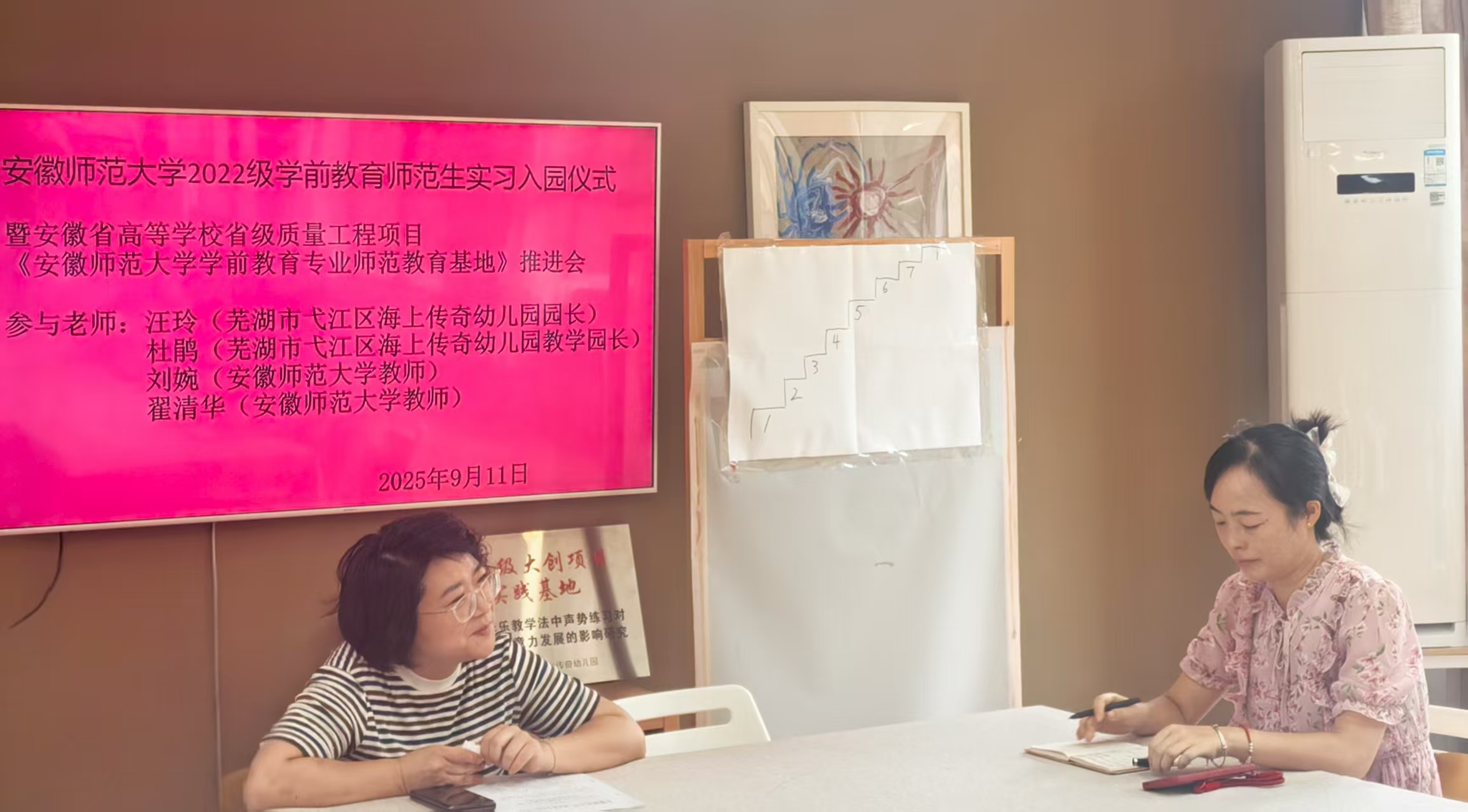 2025年9月11日上午,安徽royal皇家88平台2022级学前教育专业8名同学,赴芜湖市弋江区海上传奇幼儿园开展为期16周的教育实习。海上传奇幼儿园园长汪玲、教学园长杜娟,教育科学学院带队教师刘婉、翟清华共同出席实习入园仪式。
