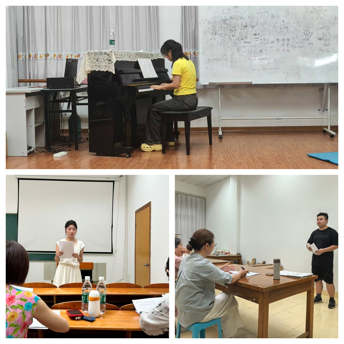 本次学前教育专业师范生技能大赛分为两个阶段,第一个阶段,从6月20日到7月6日,本科生专业导师小组组内进行选拔,小组内选拔出的同学参加第二个阶段的选拔。第二阶段于9月6日下午开展,参加第二个阶段选拔活动的专业教师有学前教育专业吴玲、赵学菊、朱立新、张志华、李晓博、翟清华等老师。本次活动由王成刚老师主持,活动在山上琴房开展, 23级学前教育全体进入第二阶段选拔的同学参加了本次活动。
