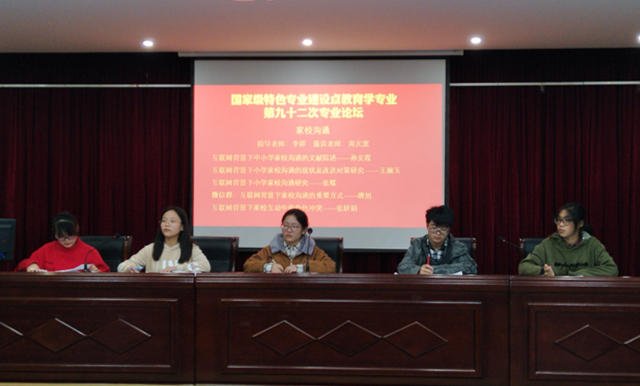 王婉玉小组的五位同学以“互联网背景下中小学家校沟通”为主题进行了精彩的汇报。第一位汇报人孙文霞立足于互联网背景时代背景,通过对相关文献进行梳理,围绕国内外学界对家校沟通的研究展开文献综述。第二位汇报人王婉玉立足于对问卷的分析和对文献的查询,从互联网背景下家校沟通的现状、改进对策、总结三部分对文章进行了详细介绍。第三位汇报人张蝶指出,她所调查的两所小学在家校沟通方面的开展效果较好,但其中不可避免地存在一些问题,如缺乏对孩子主体的深刻理解,没有很好地调动孩子主动性。同时,她也提出了两个建议,即关注孩子对家、校的角色期待和家校重视孩子在沟通中的职能。第四位汇报人唐旭研究的是互联网背景下家校沟通的新方式——微信群。唐旭同学微信群的内涵、特点及教育应用三个方面向同学们做了详细地分析。最后一位汇报人张妍娟所汇报的主题是“互联网背景下家校互动中的角色冲突”。她从概念界定、角色冲突的表现、原因及解决方法三方面阐述了她的论文。她指出,家长和教师在教育孩子的问题上产生冲突是必然的,对此双方更应该去积极沟通,将冲突最小化。徐赟老师在小组成员汇报后强调,同学们要重视专业论坛论文的修改环节,积极反馈对于专业论坛的改进意见。在评教时应做到认真、客观对待。此外,工作组的同学也应积极配合老师完成本学期的收尾工作。