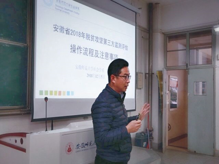 为进一步扎实完成安徽省扶贫办关于做好2018年脱贫攻坚第三方监测评估工作, 12月5日下午,我院召开了脱贫攻坚第三方监测评估动员培训会,会议邀请了安徽师范大学历社学院的副教授路幸福为我院师生就操作流程及注意事项进行讲解。路幸福提出“第三方”的独立性是保证此次评估结果公正的起点,我们要当“记录者”,不能当“过路客”和“裁判员”,要尊重帮扶干部的工作但对于出现的问题也不能掩盖,在整个评估过程中我们要保持独立并及时进行工作总结,牢记“两不愁三保障”这个评估标准,要与评估对象充分沟通,尽量做到对“三精准”、“三落实”情况的了解和多方验证。