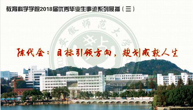 她是来自教育科学学院2018届教育学(师范)专业的陈代会。她说:安徽师范大学大学给了我们从零开始成长的机会。她的家乡在四川米易县,那个小县城靠近凉山,她深知山区学习的不易,所以其梦想是成为一名优秀的人民教师,回到四川,为家乡的教育事业尽一份力。